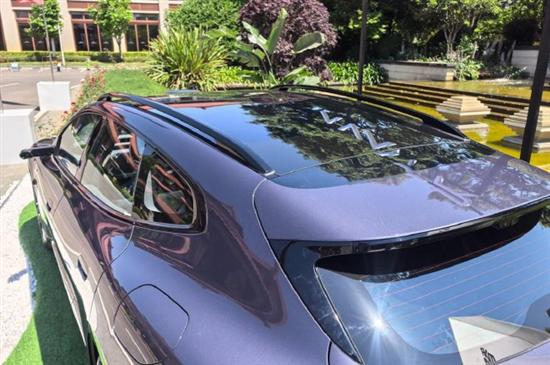 车尾部分,它拥有非常敦厚的视觉效果,顶部配备车顶扰流板,贯穿式车灯+自发光的LOGO更符合当下的造车潮流,整体尾部也显得比较圆润,设计符合当下新能源车的流行元素。因为是一部猎装旅行车,它的车窗部分呈现轿跑车不常用的发倾角设计,对比一般的轿车和旅行车视觉上完全不同,视觉效果很是独特。