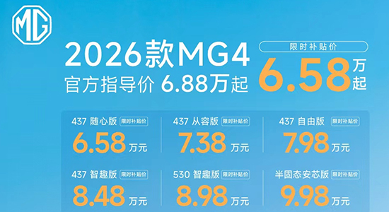 4月24日,新款MG4于2026北京车展正式上市 共推出6款配置,官方指导价6.88-10.28万元,同时还推出了限时补贴价6.58-9.88万元。新车主要针对配置进行优化升级,并且还推出了搭载半固体电池的版本。