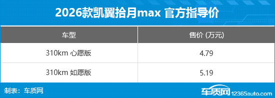 2026年4月28日,凯翼拾月max正式上市,新车共推出2款车型,官方指导价4.79-5.19万元,限时权益价仅为4.59-4.99万元。同时,官方还限时推出膨胀礼、畅充礼等购车权益。